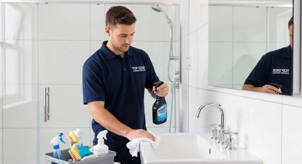 - Bathrooms: disinfecting toilets, descaling taps and showerheads, polishing mirrors, scrubbing tiles and grout, and deep-cleaning bathtubs.