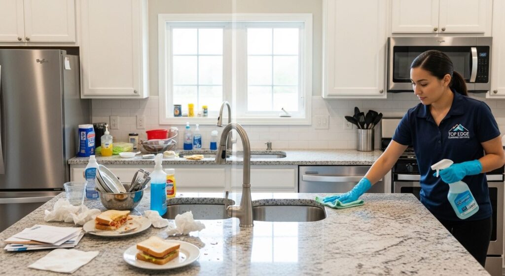 - Kitchen: degreasing cooker hoods, scrubbing ovens, cleaning fridge interiors, wiping cupboards inside and out, sanitising countertops, and washing sinks.